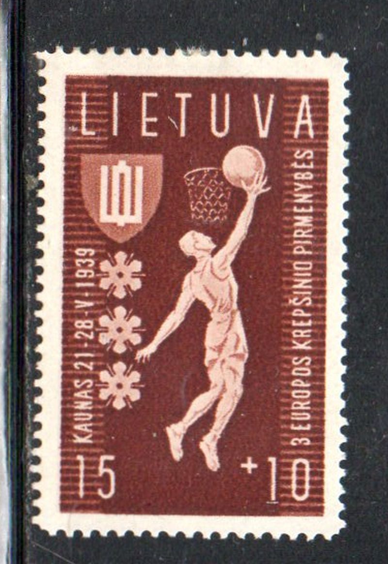 Lithuania Scott Catalogue number B52 1939 15 + 10 Basketball Championships stamp .Mint, fine original gum hinged .Canadian Customers - I pay the GST/HST on your purchases from me .25-12-11.jpg