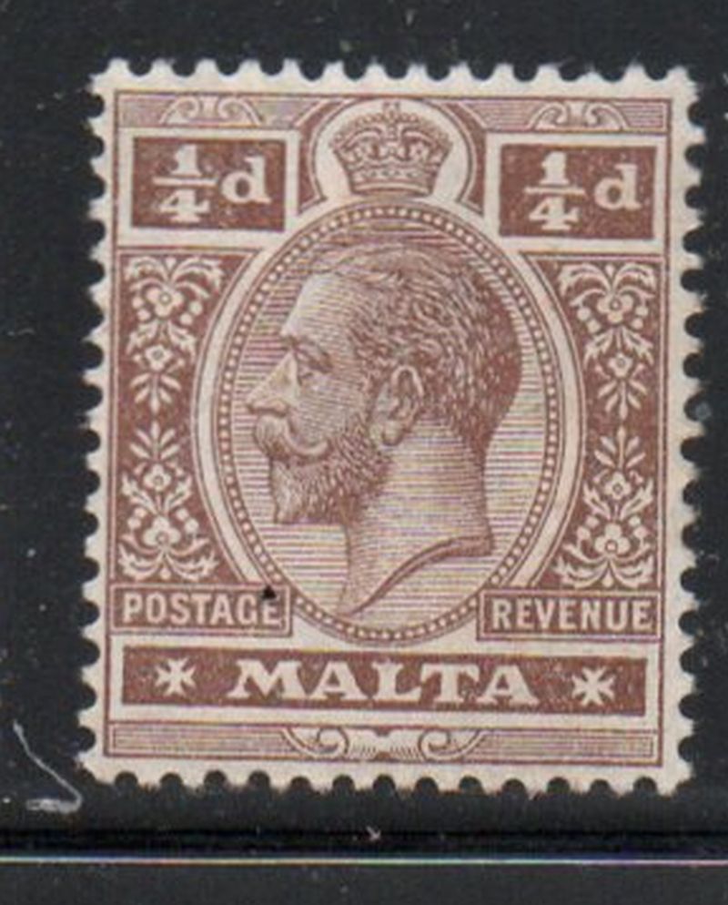 Malta Scott Catalogue number 49 1914 1/4 d brown George V stamp .Mint, very good to fine , original gum hinged Member Canadian Stamp Dealers Association . Canadian Customers - I pay the GST/HST on your purchases from me .25-4-60.jpg