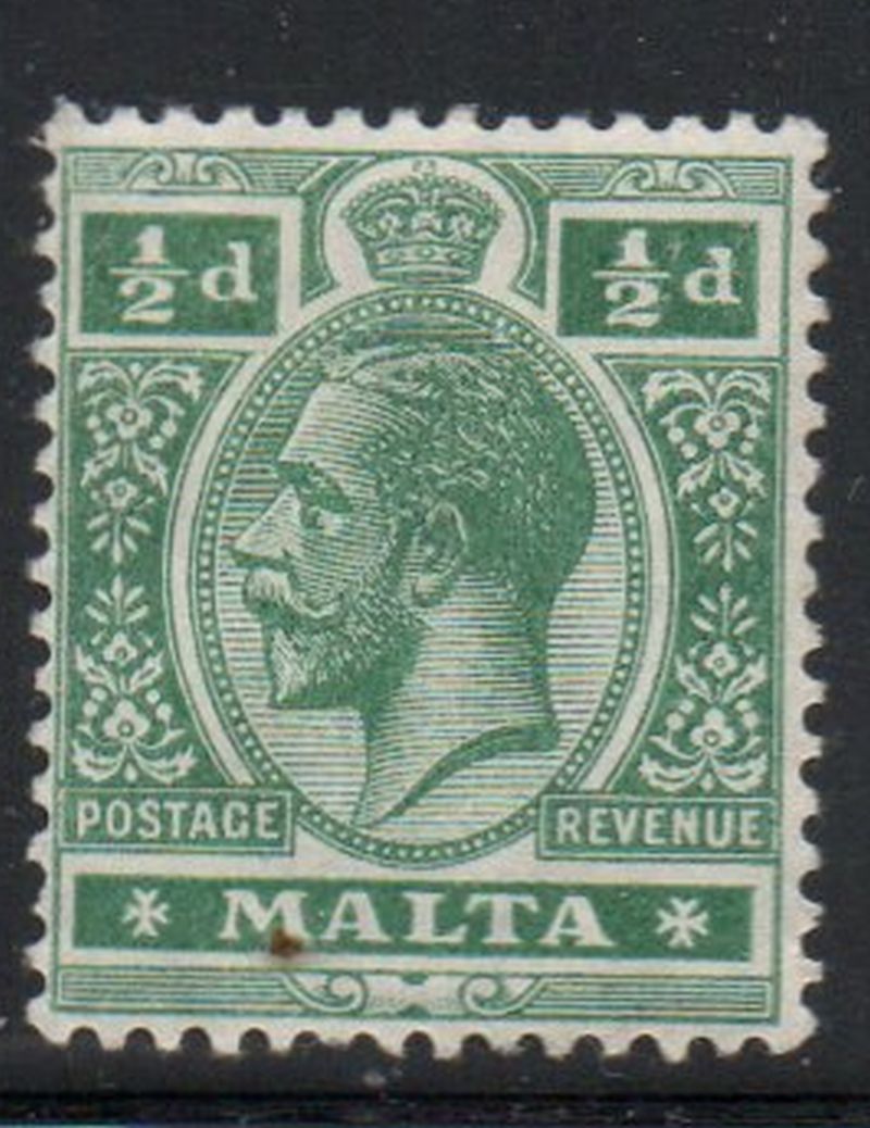 Malta Scott Catalogue number 50 1914 1/2 d green George V stamp .Mint, very good to fine , original gum hinged Member Canadian Stamp Dealers Association . Canadian Customers - I pay the GST/HST on your purchases from me .25-4-61.jpg