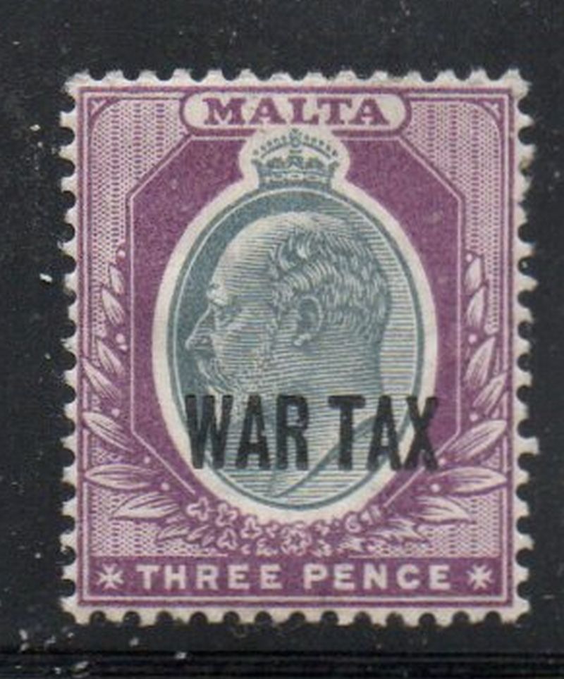 Malta Scott Catalogue number MR2 1918 3d Edward VII stamp with WAR TAX overprint .