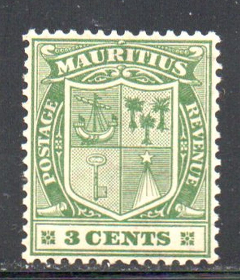 Mauritius Scott Catalogue number 139 1910 3 cent green Seal of Colony stamp . Mint, very good to fine, original gum hinged .Member Canadian Stamp Dealers Association .Canadian Customers - I pay the GST/HST on your purchases from me .25-6-121.jpg