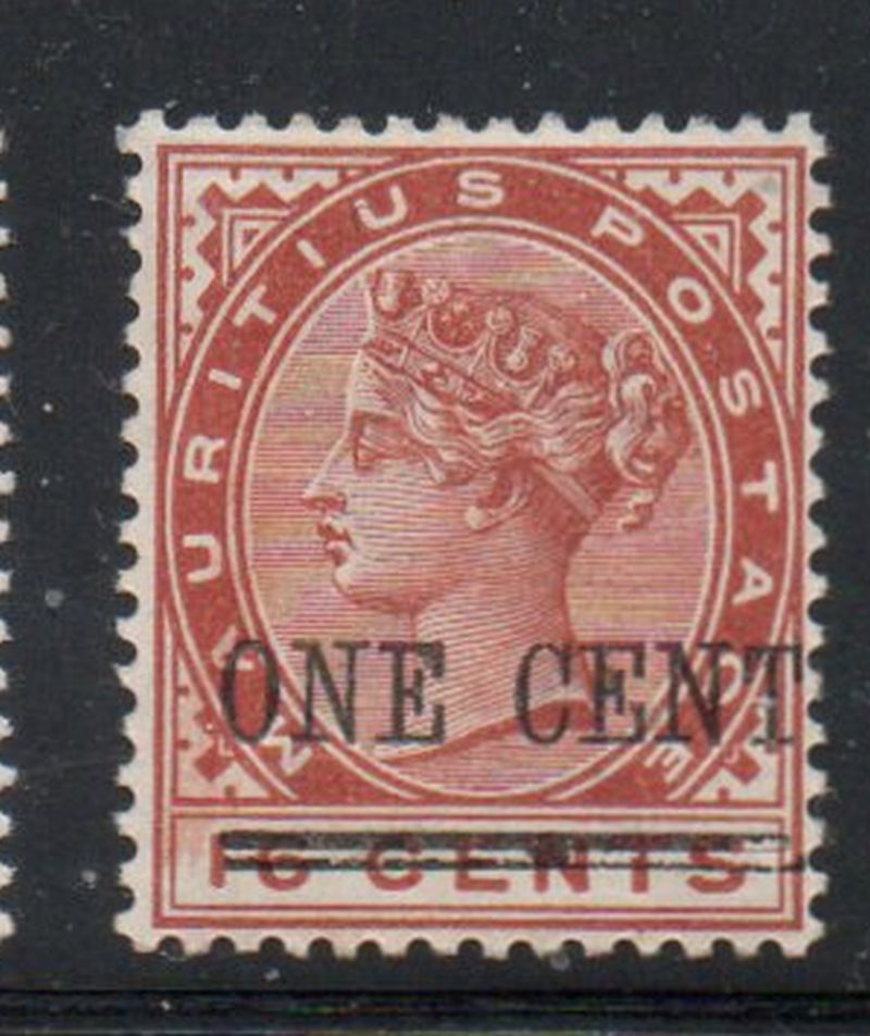 Mauritius Scott Catalogue number 90 1893 ONE CENT overprint on 16 cent orange brown Victoria stamp.
