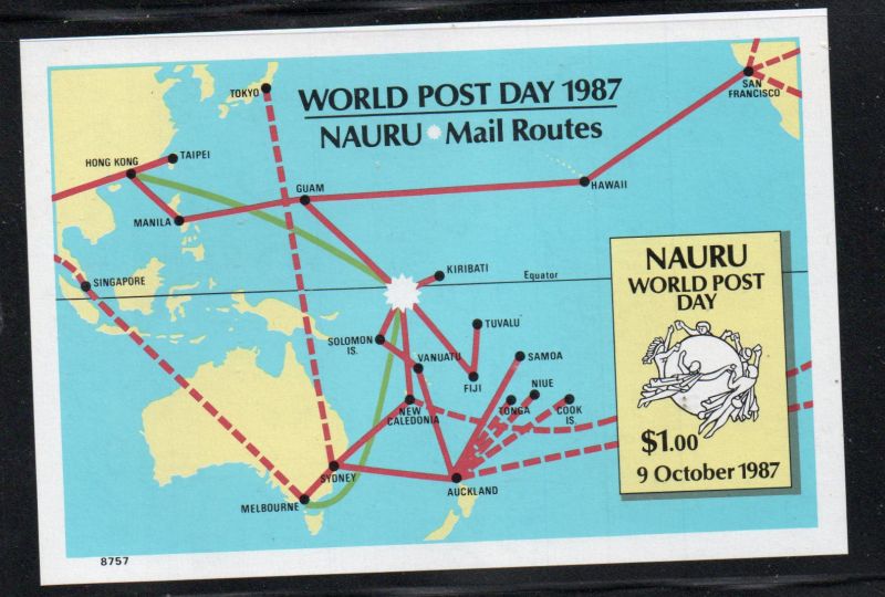Nauru  Scott  Catalogue number  339 1987 World Post Day Nauru Mail Routes stamp souvenir sheet.Mint fine to very fine, original gum never hinged .Member Canadian Stamp Dealers Association .Canadian Customers - I pay the GST/HST on your purchases from me .