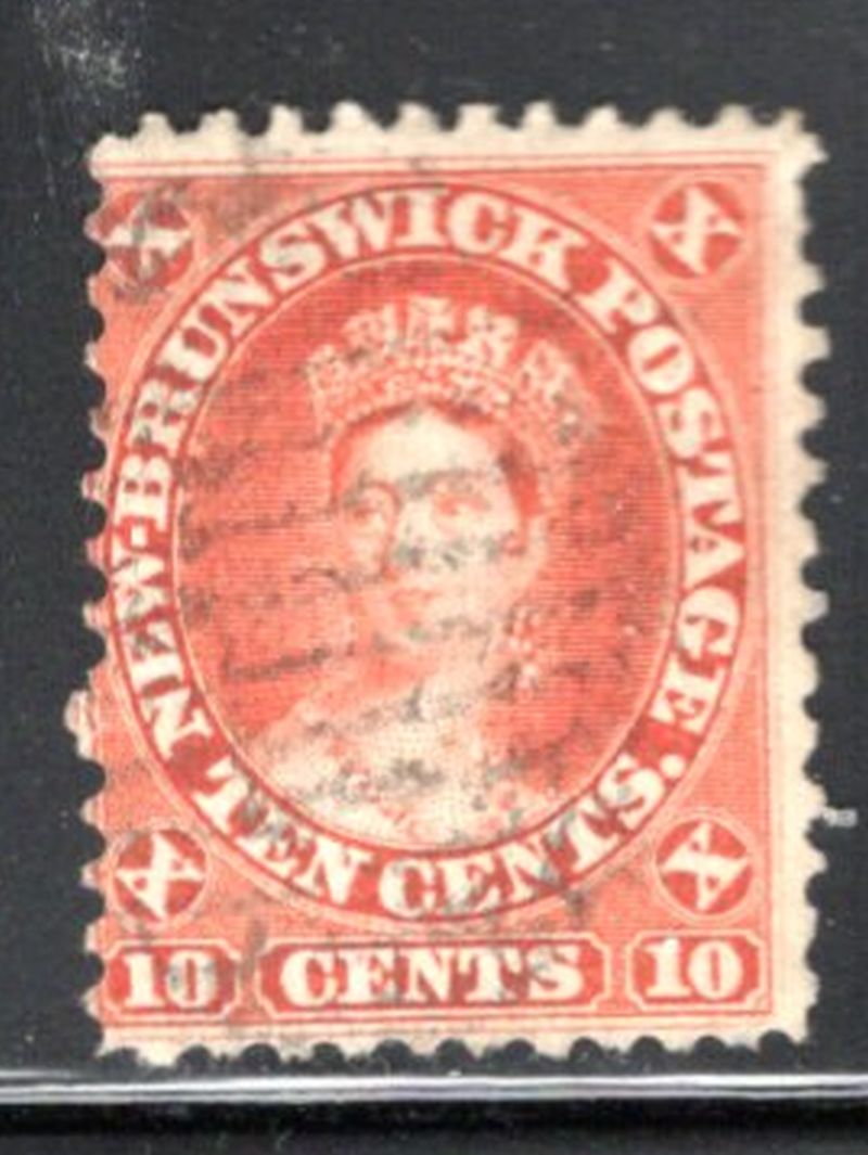 New Brunswick Scott & Unitrade Catalogue number 9 1860 10 cent vermilion Victoria stamp.Used, very good to fine.Canadian Customers - no added GST/HSTUS customers - No tariffs on stamps sent by meMember Canadian Stamp Dealers Associationbr26-3-47.jpg