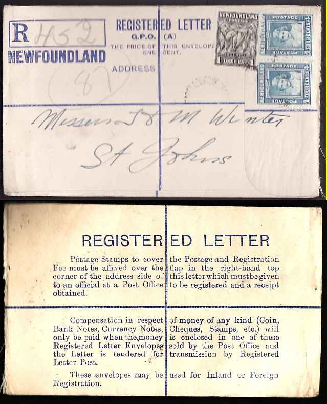Scan #11262 - 1c Cod + 4c(2) Princess Elizabeth on registered envelope with rounded flap [RE1] - Cottrell's Cove Green Bay, NEWF'D -Â
