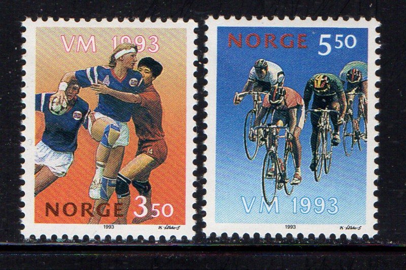 Norway Scott Catalogue number 1040-1041 1993 Sports Championships stamp set .Mint, fine to very fine, original gum never hinged .Member Canadian Stamp Dealers Association .Canadian Customers - I pay the GST/HST on your purchases from me .