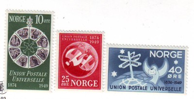Norway Scott Catalogue number 299-301 1949 75th Anniversary Universal Postal Union stamp set Mint, fine to very fine, original gum never hinged . .Member Canadian Stamp Dealers Association .Canadian Customers - I pay the GST/HST on your purchases from me .