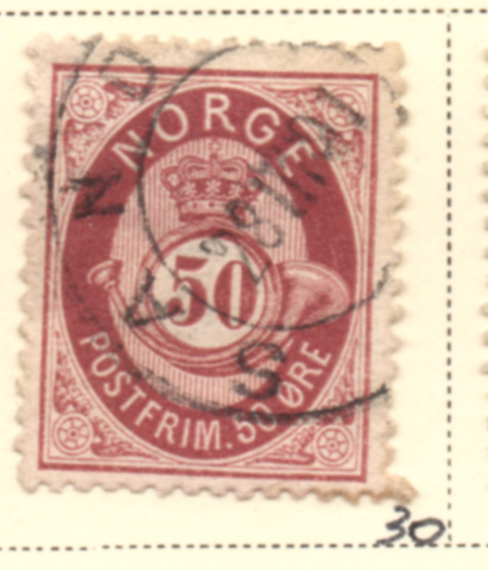 Norway Sc 30 1877 50 ore maroon posthorn stamp used