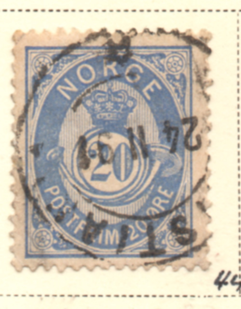 Norway Scott Catalogue number 44 1886 20 ore blue posthorn stamp .