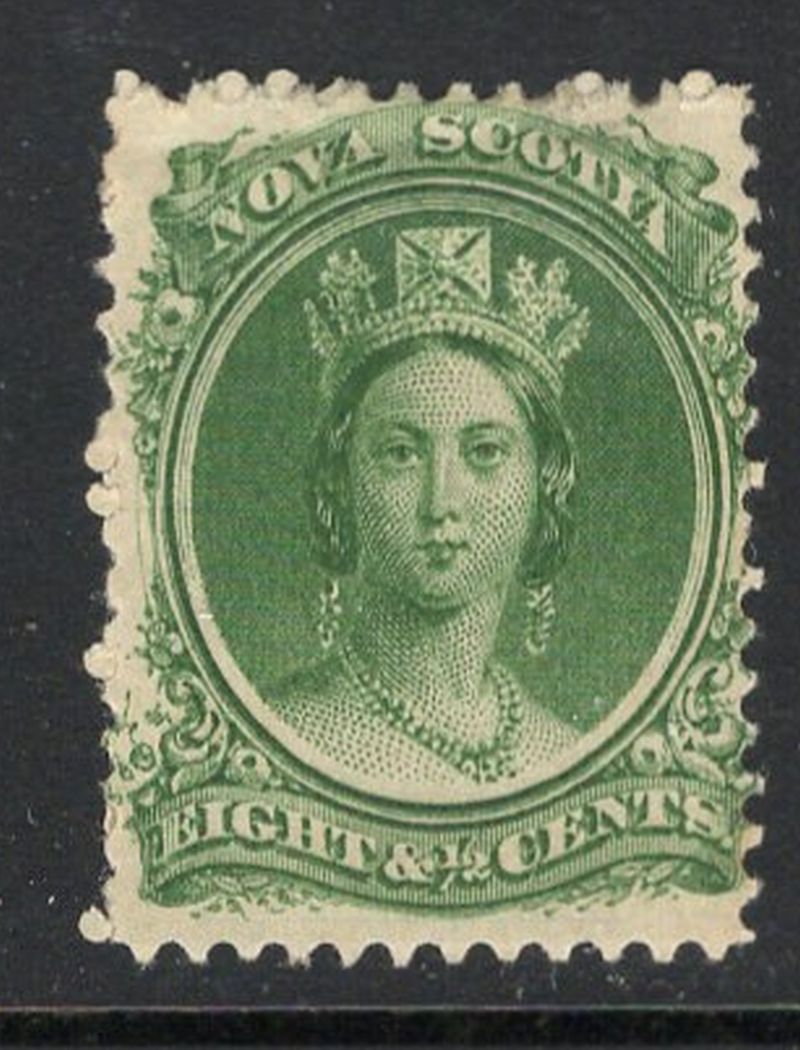Nova Scotia Scott & Unitrade Catalogue number 11 1860 8 1/2 cent green Victoria stamp.Mint, very good to fine, original gum hinged.Canadian Customers - no added GST/HSTUS customers - No tariffs on stamps sent by meMember Canadian Stamp Dealers Association.br26-4-37.jpg