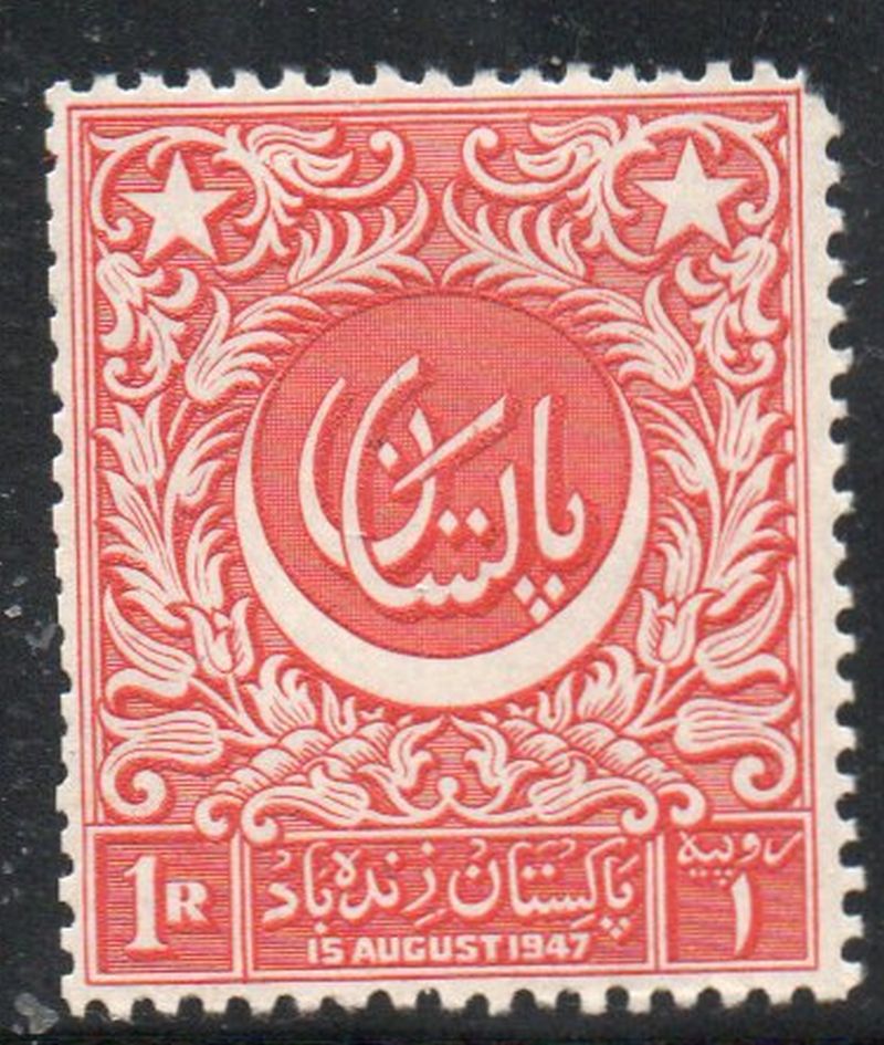Pakistan Scott Catalogue number 23a 1948 1 Rs Independence stamp perforated 14.Mint, very good to fine fine, original gum hinged   Member Canadian Stamp Dealers Association .Canadian Customers - I pay the GST/HST on your purchases from me .25-8-26.jpg
