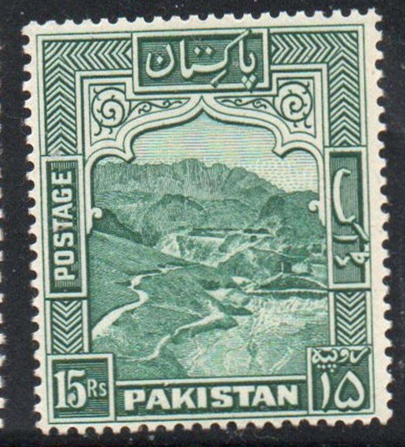 Pakistan Scott Catalogue number 42a  15Rs blue green Khyber Pass stamp perforated 14 .Mint,  fine, original gum never hinged   Member Canadian Stamp Dealers Association .Canadian Customers - I pay the GST/HST on your purchases from me .25-8-29.jpg