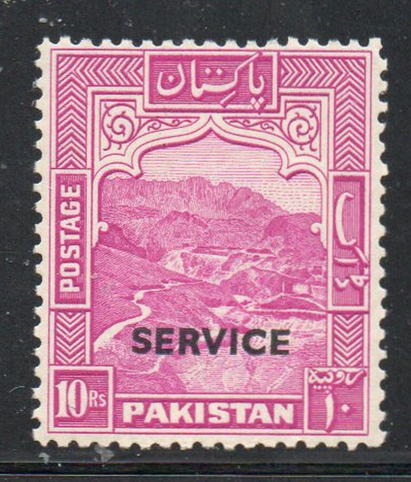 Pakistan Scott Catalogue number O26a (perforated 12) 1948 rose lilac 10 Rs Official stamp  overprinted SERVICE  .Mint,   fine, original gum hinged   Member Canadian Stamp Dealers Association .Canadian Customers - I pay the GST/HST on your purchases from me .25-8-33.jpg