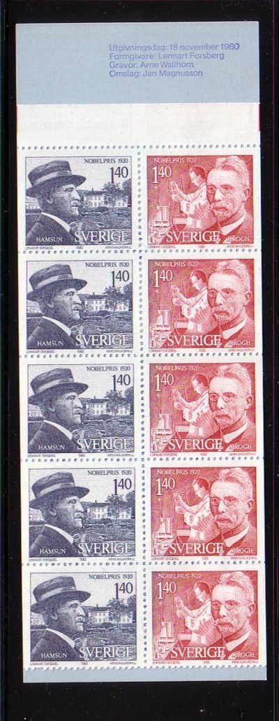 Sweden Scott Catalogue number 1342a 1980 Nobel Peace Prize stamp booklet pane in complete booklet.Mint, fine to very fine original gum never hinged .Canadian Customers - I pay the GST/HST on your purchases from me .