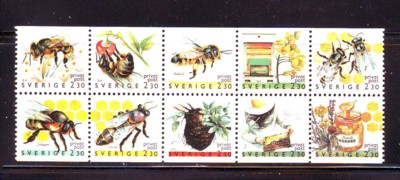 Sweden  Scott Catalogue number 1819-1828 1990 Bees Apiculture stamp set .Mint, fine to very fine, original gum never hinged .Canadian Customers - no added GST/HSTUS customers - No tariffs on stamps sent by meMember Canadian Stamp Dealers Association