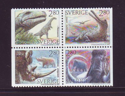 Sweden  Scott Catalogue number 1969-1972  1992 Prehistoric Animals stamp set .Mint, fine to very fine, original gum never hinged .Canadian Customers - no added GST/HSTUS customers - No tariffs on stamps sent by meMember Canadian Stamp Dealers Association