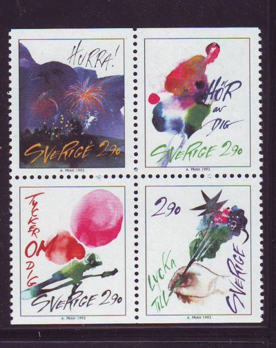 Sweden Scott Catalogue number 2024-2027 1993 Greetings stamp set .Mint, fine to very fine original gum never hinged .Canadian Customers - no added GST/HSTUS customers - No tariffs on stamps sent by meMember Canadian Stamp Dealers Association.
