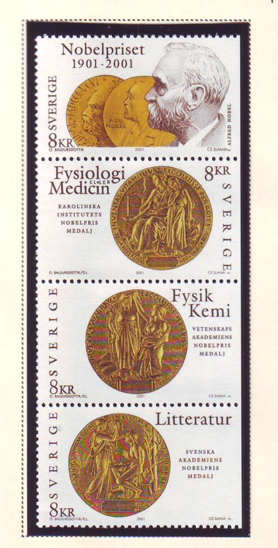 Sweden Scott Catalogue number 2415 2000 100th Anniversary Nobel Prize stamp strip of 4.