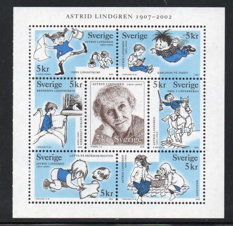 Sweden Scott Catalogue number 2431 2002 Astrid Lindgren stamp booklet pane of 7
