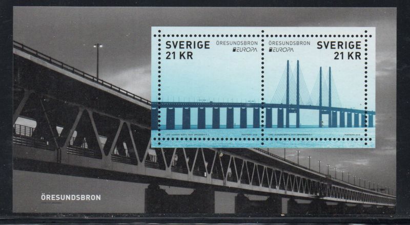 Sweden Scott Catalogue number 2822 2018 Europa, Oresund Bridge, stamp souvenir sheet .Mint, fine to very fine original gum never hinged .Member Canadian Stamp Dealers Association .Canadian Customers - I pay the GST/HST on your purchases from me .