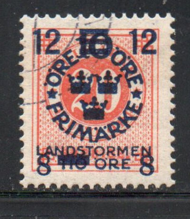 Sweden Scott Catalogue number B27 1918 12 + 8 overprint on 20 ore stamp, surcharge for Militia .Used, fine to very fine .Member Canadian Stamp Dealers Association .Canadian Customers - I pay the GST/HST on your purchases from me .25-6-9.jpg