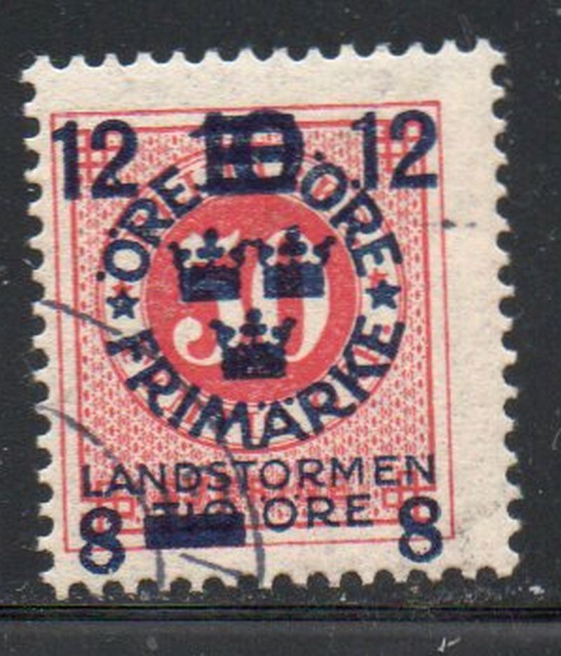 Sweden Scott Catalogue number B31 1918 12 + 8 overprint on 50 ore stamp, surcharge for Militia .Used, fine .Member Canadian Stamp Dealers Association .Canadian Customers - I pay the GST/HST on your purchases from me .25-6-12.jpg