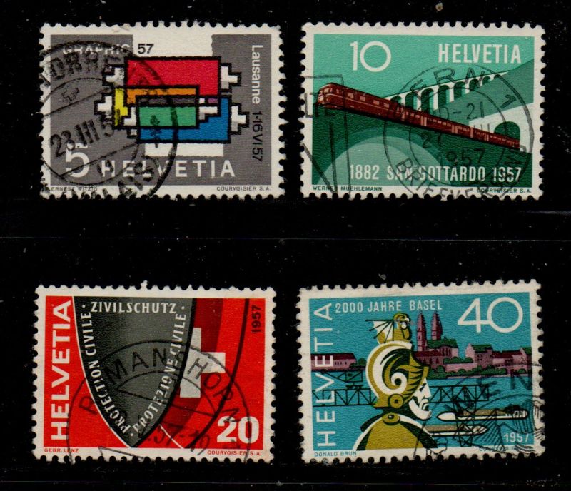 Switzerland Scott Catalogue number 359-362 1957 Various Anniversaries stamp set .Used, fine to very fine .Member Canadian Stamp Dealers Association .Free Shipping on purchases over $50 going to North America .Canadian Customers - I pay the GST/HST on your purchases from me .