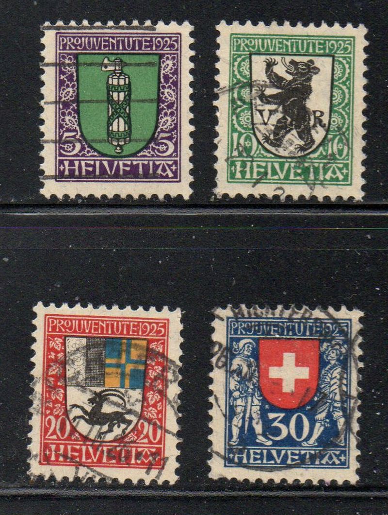 Switzerland Scott Catalogue number B33-B36 1925 Coats of Arms stamp set.Used, fine to very fine.Canadian Customers - no added GST/HSTUS customers - No tariffs on stamps sent by meMember Canadian Stamp Dealers Association21-5-22.jpg