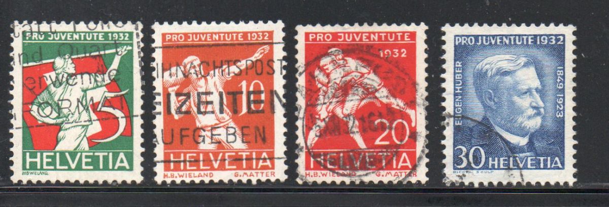 Switzerland Scott Catalogue number B61-64 1932  Pro Juventute Sports  stamp set.Used, fine to very fine.Member Canadian Stamp Dealers Association .Free Shipping on purchases over $50 going to North America .Canadian Customers - I pay the GST/HST on your purchases from me .20-12-67.jpg