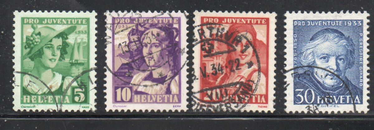 Switzerland Scott Catalogue number B65-68 1933  Pro Juventute Girls stamp set.Used, fine to very fine.Member Canadian Stamp Dealers Association .Free Shipping on purchases over $50 going to North America .Canadian Customers - I pay the GST/HST on your purchases from me .20-12-68.jpg