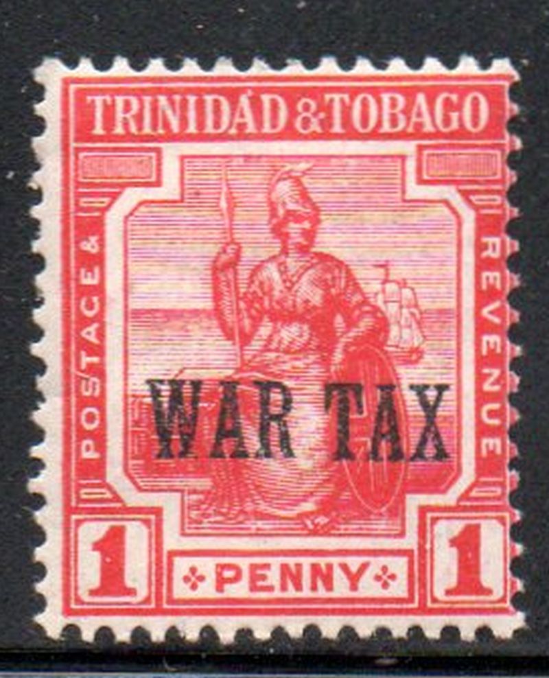 Trinidad & Tobago Scott Catalogue number MR1 1917 1 d scarlet Britannia stamp with one line WAR TAX overprint .Mint, very good to fine, original gum  hinged .Member Canadian Stamp Dealers Association .Canadian Customers - I pay the GST/HST on your purchases from me .25-8-54.jpg