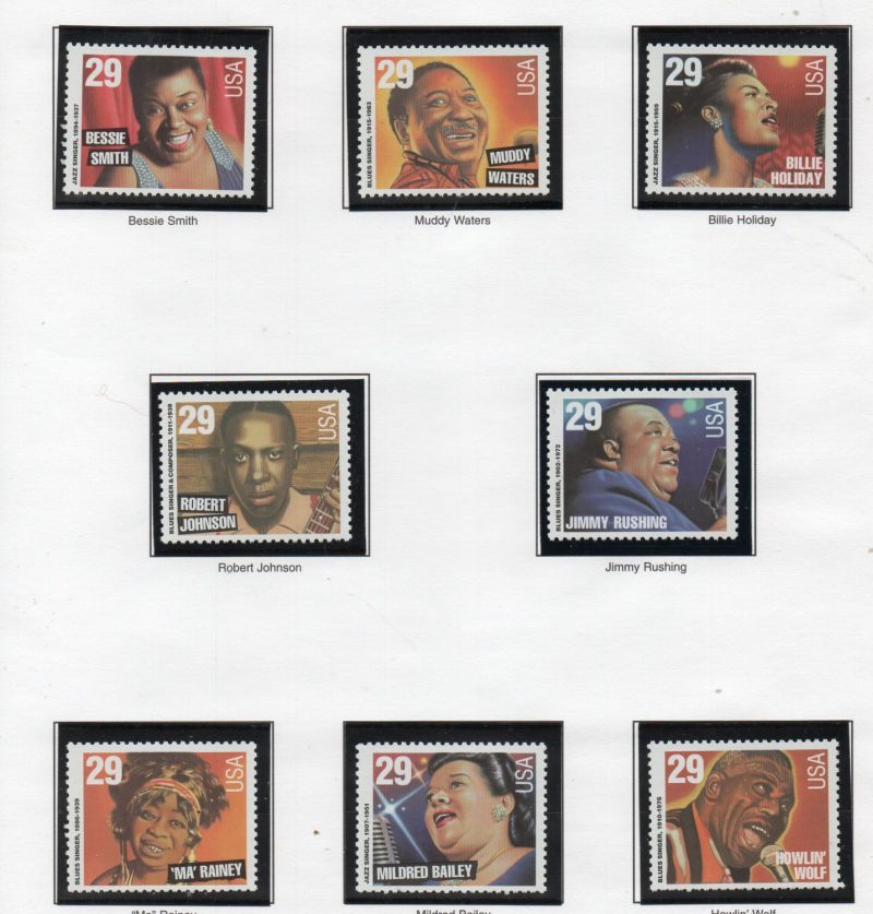 United States of America Scott Catalogue number 2854-2861 1994 Blues & Jazz singers stamp set .Mint, fine to very fine, original gum never hinged.Member Canadian Stamp Dealers Association .Free Shipping on purchases over $50 going to North America.Canadian Customers - I pay the GST/HST on your purchases from me .