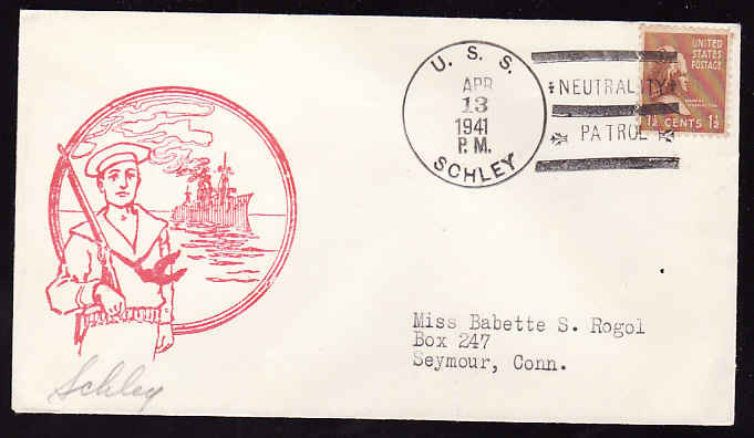 Scan #11924 - 1&1/2c Martha Washington-cachet cover [ USS Schley] - Apr 13 1941 - "Neutrality Patrol" -
