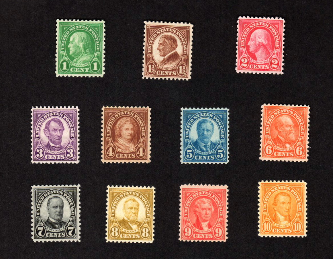 This lot contains a set of 11 different mint never hinged perf 11 x 10 ½ stamps from the United States. These stamps are Scott # 632 – 642 issued 1926 – 1934. Most are Very Fine with a couple being Fine – Very Fine.